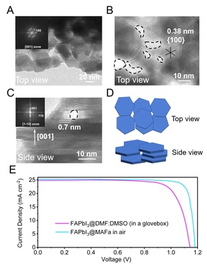 高湿度条件下制备的PbI2@MAFa薄膜的HRTEM图像(A和B)和相应的傅里叶变换(C)和提出的PbI2@MAFa晶体堆叠模式示意图(D)以及FAPbI3@MAFa器件的J-V曲线 (E)