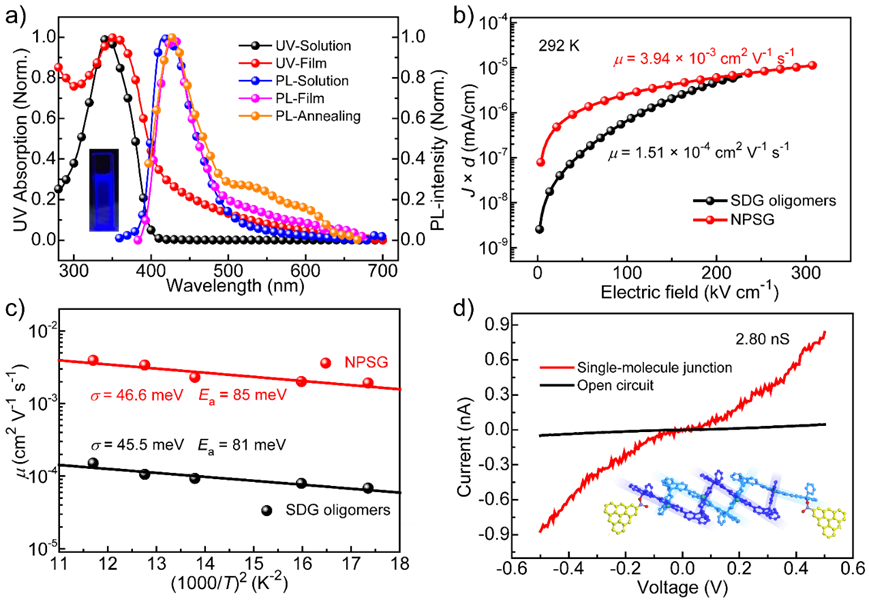 在物化与光电特性方面研究发现,该聚螺格的重复单元为26(格数25)、Mark-Houwink 指数为1.175,借助同步辐射小角X射线散射技术探索其骨架分形维度为~0.8,证明其聚螺格为刚性的线性骨架,同时获得了其持续链长的实验值(~41 nm)。通过光学测试,发现其光学能隙(Eg)随着持续链长增加而下降(从3.33 eV降至~3.11 eV),这就表明了共价纳米尺度效应可能有利于其π打断型骨架的激子离域。该纳米聚螺格薄膜即使处于无定型态,借助空间电荷限制电流方法,发现仍然具有3.94 × 10-3 cm2 V-1 s-1的空穴迁移率(图2),该数值已几乎超越所有共轭打断骨架甚至共轭骨架分子的迁移率水平(无定型状态下)。通过温度依赖的迁移率变化计算出该纳米聚螺格具有超低的能量无序度σ = 46.6 meV,验证了纳米聚螺格的共价纳米有序化效应能降低载流子输运过程中的能量损耗与缺陷态,从而提高了载流子迁移率(图2),此外作者还测量了单分子电导,其导电率约为~2.8 nS,明显低于大部分全共轭分子线,暗示了在低能耗分子纳米器件与电路方面具有潜在优势(图2)。