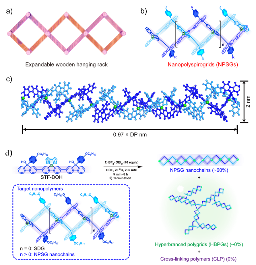 首先,借助原创的格子化学平台,他们设计了A2B2型纳米合成子,实现了跨尺度的聚格子化聚合反应合成了有机纳米聚合物——聚螺格(NPSGs,图1),其双键模式有利于降低聚格主链的构象熵与构象缺陷,从而展现出特殊的共价纳米有序化效应,有效地克服了分子纳米尺度的限制从而传递偶极极化、实现高介电物理电学特性。