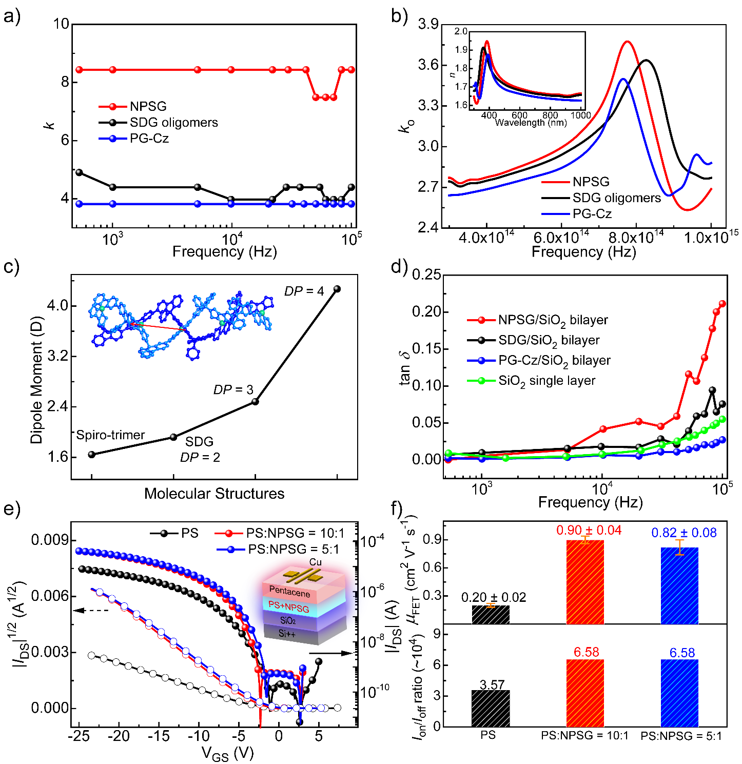 而后,作者发现纳米聚螺格可借助高度刚性骨架提高偶极极化作用,从而展现出高介电常数特征(k = 8.43),该特征可作为重要的介电掺杂剂应用于有机场效应晶体管。最后,将其和PS共混调控晶体管的介电层,发现PS:NPSG(10:1)时并五苯的空穴载流子迁移率可以超过0.90 cm2/V.s,进一步证明了高介电NPSG材料的优势(图3)。