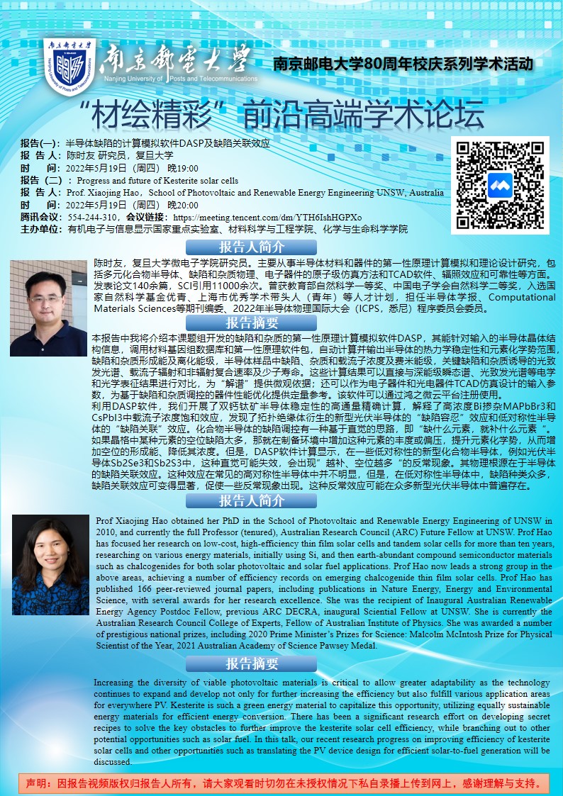 复旦大学陈时友研究员&Prof. Xiaojing Hao,School of Photovoltaic and Renewable Energy Engineering UNSW 学术报告