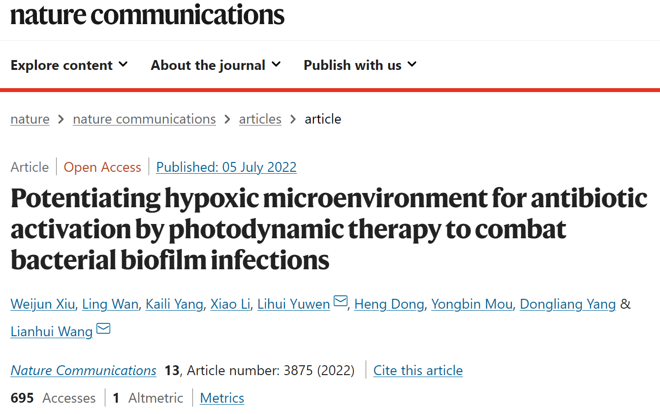 近日,南京邮电大学汪联辉教授和宇文力辉副教授团队与南京工业大学杨栋梁副教授、南京大学医学院附属口腔医院牟永斌教授开展合作研究,在细菌生物膜感染治疗领域取得重要进展,提出通过增强乏氧微环境调控细菌代谢并激活药物的新型高效治疗策略。相关成果以Potentiating hypoxic microenvironment for antibiotic activation by photodynamic therapy to combat bacterial biofilm infections为题发表在国际顶级学术期刊Nature Communications(《自然·通讯》)上。