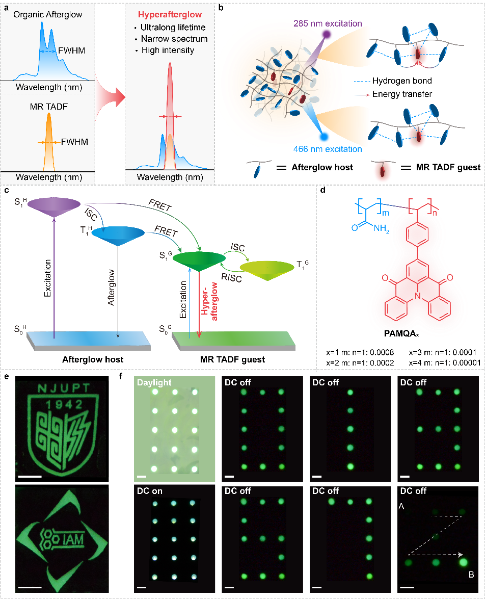 有机长余辉通常是指在撤去激发源后有机材料仍能够持续发光的现象,这种特殊的光学性质使得这类材料有着极大的潜力应用于高级信息加密和防伪、传感、余辉显示以及生物/X光成像等领域。近年来,研究者们通过晶体工程、主客体掺杂、聚合等方法在调节有机长余辉材料寿命和发光颜色等方面取得了显著进展。但是受限于三线态激子固有的较大结构弛豫和自旋禁阻的缓慢辐射衰减过程,使得目前有机长余辉材料的余辉发光色纯度和发光效率难以满足高分辨率、高效率和广色域的显示应用需求。因此,如何实现发射光谱窄和发光效率高的有机超余辉发射仍是一个艰巨的挑战。