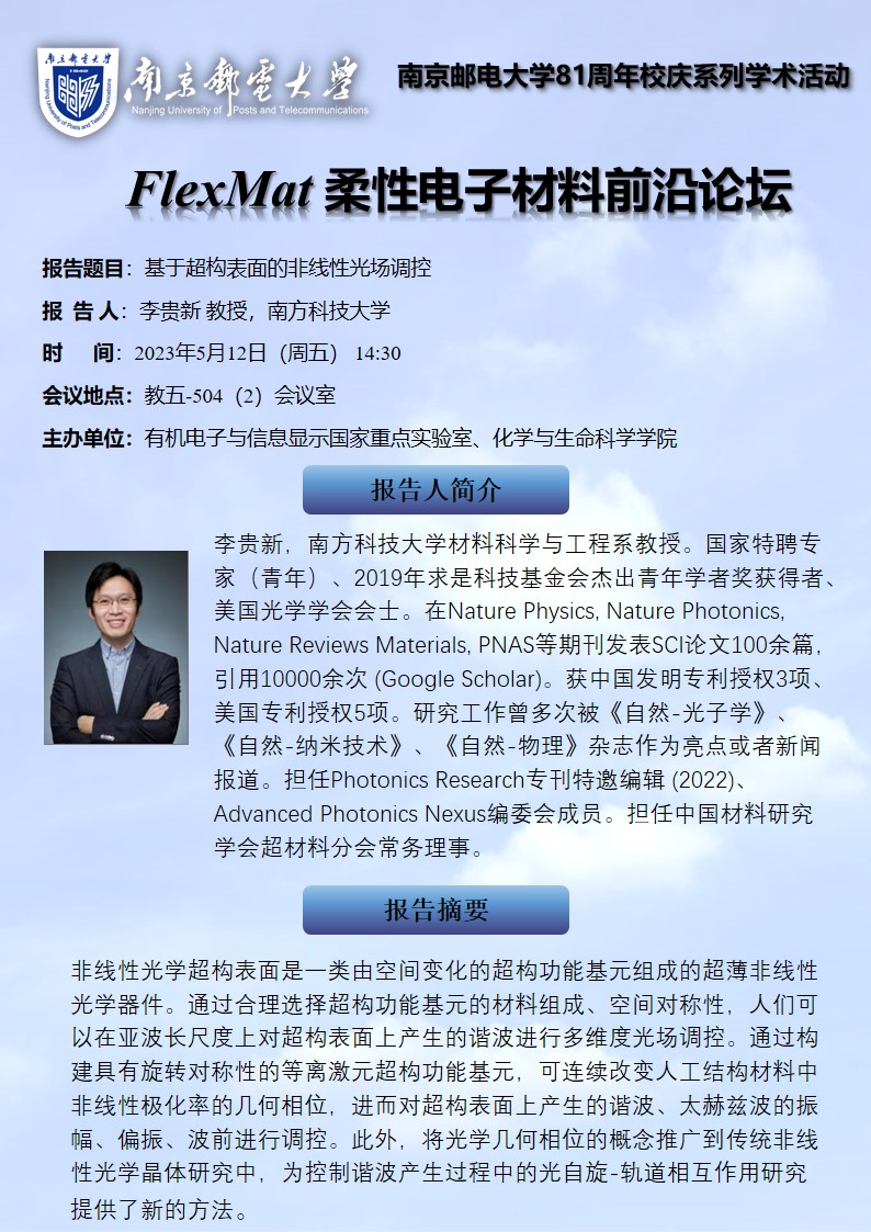 FlexMat柔性电子材料前沿论坛:南方科技大学李贵新教授学术报告