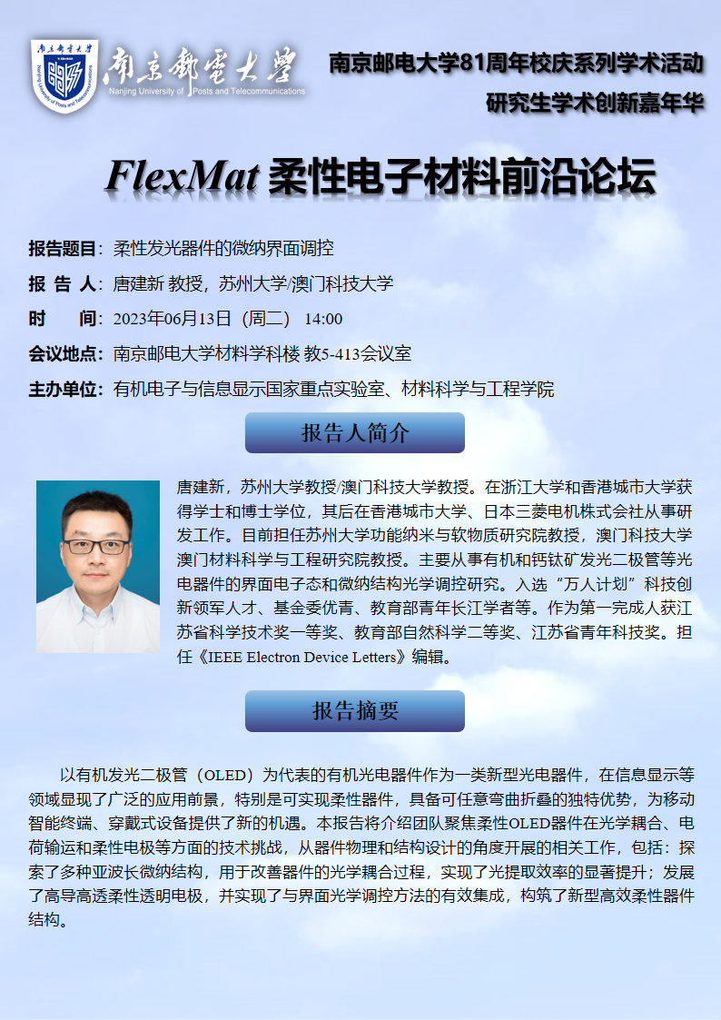 FlexMat柔性电子材料前沿论坛:苏州大学/澳门科技大学唐建新教授学术报告