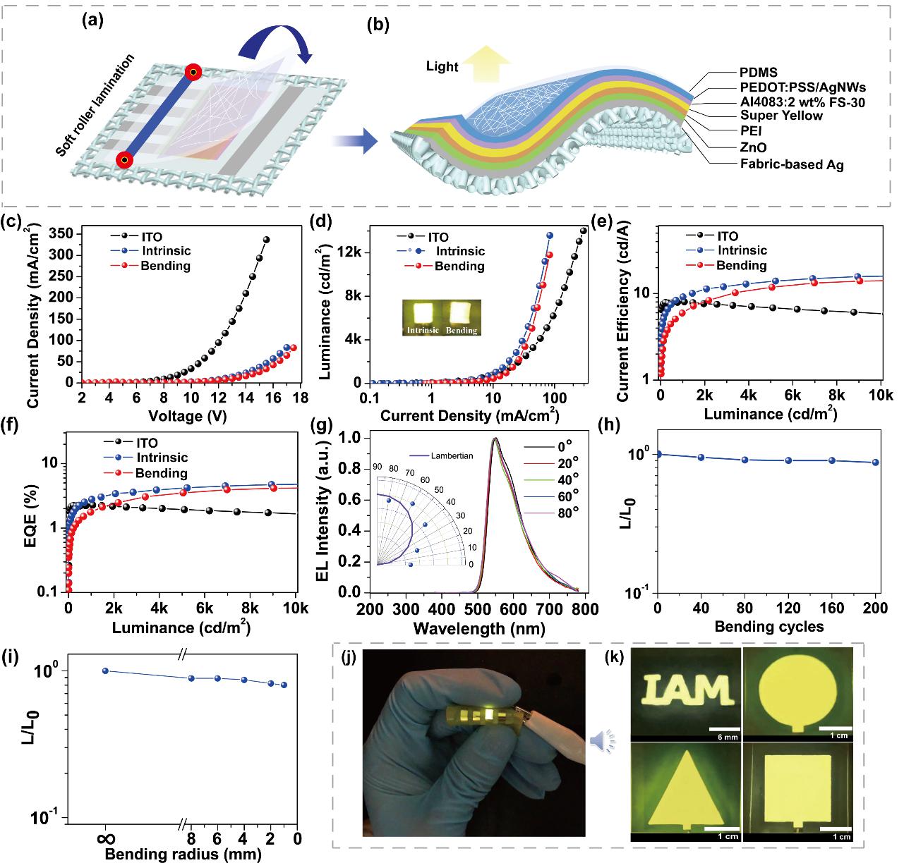 针对这一难题,有机电子与信息显示国家重点实验室张新稳教授与陈月花副教授课题组提出了柔性大面积RBE和TTE的全溶液印刷制备方案,研制出织物衬底的可穿戴顶发射聚合物发光器件(Fa-TPLED)。通过快速银镜反应并结合剥离技术在织物衬底上制备出高反射率银阴极(~94%)和高透光率的PDMS/AgNWs/PEDOT:PSS透明阳极(~84%),系统研究了TTE与衬底界面之间的分离机制。通过软接触层压制备出大面积Fa-TPLED,器件的电流效率为16.3 cd/A,外量子效率为4.9%,并且完全抑制了由微腔效应引起的发射光谱角度依赖性和非朗伯发射。此外,Fa-PLED具有优异的机械稳定性,在连续弯折200次(弯折半径为4 mm)后器件的电流效率仍能保持到14.3 cd/A。该研究成果为低成本、高效率的织物可穿戴器件的发展提供了一条新途径,在新兴的智能柔性/可穿戴电子产品中显示出巨大的应用潜力。相关结果以“Efficient Flexible Fabric-Based Top-Emitting Polymer Light-Emitting Devices for Wearable Electronics”为题发表在《Small》期刊上。重点实验室张新稳教授和陈月花副教授为共同通讯作者,李瑞卿博士为论文第一作者。