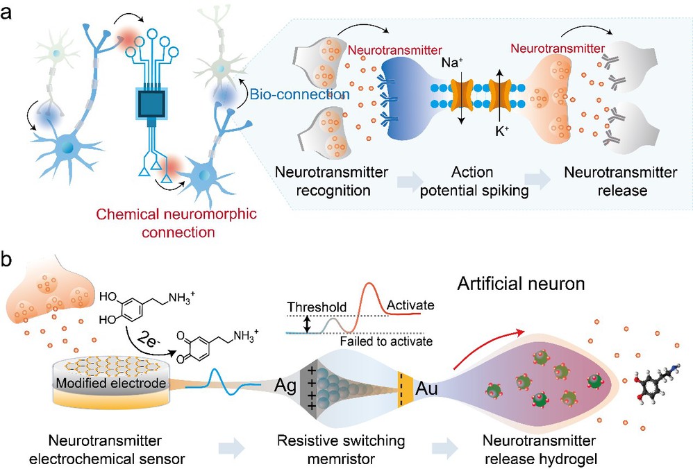 针对以上问题,王婷教授和汪联辉教授团队与合作者们开发了一种基于神经递质双向交互的人工神经元,它能够接收和自适应地定量发送神经递质多巴胺分子到活神经元。人工神经元是一个异构集成的序列柔性操作系统,包括一个多巴胺分子传感器、一个用于信号处理的忆阻器和一个多巴胺分子释放器。化学信息流遵循三个步骤:以电流信号响应作为输出的多巴胺分子激活传感器,通过电流信号对忆阻器的内阻状态进行适应性调制,以及受忆阻器电流输出控制的水凝胶致动分子释放器。该系统可用于生物混合界面,表明该化学驱动型人工神经元可以响应 PC12 细胞的分子胞吐作用,并释放多巴胺以反馈激活 PC12 细胞,实现类中间神经元的化学通讯。我们还证明了该人工神经元通过动态多巴胺分子刺激触发活鼠后肢弯曲和机械臂的可控反馈。