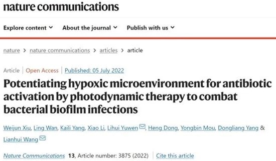 近日,有机电子与信息显示国家重点实验室汪联辉教授和宇文力辉副教授团队与南京工业大学杨栋梁博士、南京大学医学院附属口腔医院牟永斌教授开展合作研究,在细菌生物膜感染治疗领域取得重要进展,提出通过增强乏氧微环境调控细菌代谢并激活药物的新型高效治疗策略。相关成果以Potentiating hypoxic microenvironment for antibiotic activation by photodynamic therapy to combat bacterial biofilm infections为题发表在国际顶级学术期刊Nature Communications(《自然·通讯》)上。
