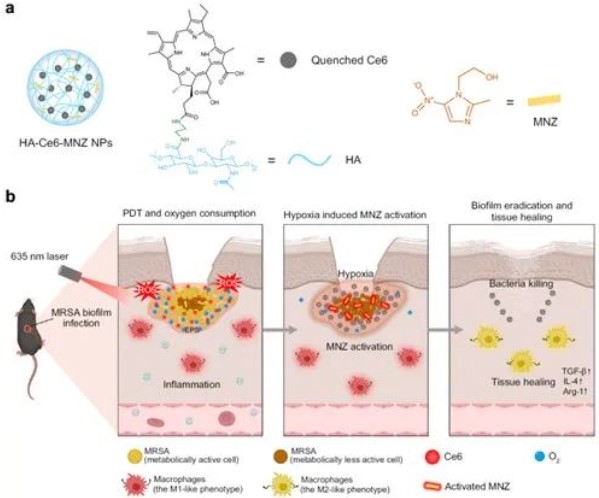 针对以上问题,汪联辉教授和宇文力辉副教授团队构建了一种由透明质酸、光敏剂二氢卟吩(Ce6)和甲硝唑(MNZ)组成的纳米试剂(HCM),用于耐甲氧西林金黄色葡萄球菌(MRSA)生物膜感染的治疗。HCM能够在生物膜微环境中酶的作用下降解,释放Ce6和MNZ。在光照下,Ce6能够将氧气转化为活性氧,杀死生物膜表层的活性菌,并加剧生物膜的乏氧状态,诱导MRSA产生硝基还原酶,将MNZ转化为杀菌活性的咪唑片段,从而高效清除生物膜内部细菌,并抑制生物膜的再生长。以上治疗模式还可诱导巨噬细胞向M2型极化,促进伤口组织的愈合。本研究提出通过光动力治疗激活药物抗菌活性的微环境调控策略,为细菌生物膜感染高效治疗提供了新的思路。本工作得到了国家重点研发计划项目、江苏省前沿引领技术基础研究专项、江苏省自然科学基金等项目的支持。