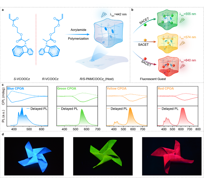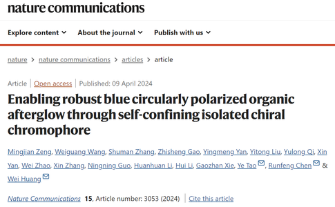 近日,有机电子与信息显示国家重点实验室黄维院士团队陶冶和陈润锋教授在手性有机长余辉领域取得新进展,提出了一种通过共价自限域手性发色团来获得蓝色手性长余辉的简单方法,设计出具有超长寿命、高发光不对称因子的蓝色手性有机长余辉聚合物。将蓝色手性余辉聚合物作为主体与荧光客体共混,利用余辉和手性协同能量传递策略,成功地实现了全彩手性余辉发射体系的构建,并探索了该类材料在信息加密、立体显示等领域的应用。4月9日,相关成果以“Enabling robust blue circularly polarized organic afterglow through self-confining isolated chiral chromophore”为题发表在Nature Communications(《自然•通讯》)上。陶冶教授、陈润锋教授和黄维院士为共同通讯作者,硕士生曾明鉴为论文第一作者,本科生王伟光为论文第二作者,南京大学的王乐勇教授在圆二色光谱测试方面给予了大力支持。