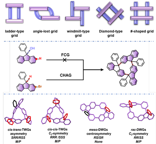 图一、五类单元格、三角风车格及其有机纳米格芳烃具体分子结构图