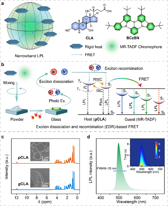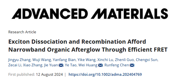 近日,有机电子与信息显示国家重点实验室黄维院士团队陈润锋教授在窄谱带有机长余辉领域取得新进展,通过简单的熔融共混将多重共振热激活延迟荧光(MR-TADF)稳定孤立在玻璃状胆甾型主体中,实现了窄带、长寿命和全色的有机长余辉。相关成果以Exciton Dissociation and Recombination Afford Narrowband Organic Afterglow Through Efficient FRET为题发表在国际顶级期刊Advanced Materials《先进材料》。陈润锋教授和黄维院士以及材料学院博士后袁杰博士为共同通讯作者,博士研究生张景瑜为论文第一作者。